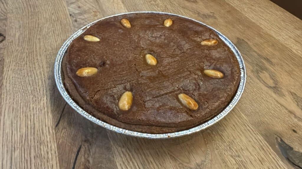Paas taart 8 persoons gevuld met Tropicalbavaroise met een hartje van tropical compote, amandelcake en afgestreken met passiecoulis.